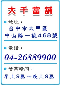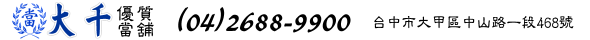 大千當鋪提供台中市后里、苑裡、大甲、外埔、大安等地區提供當舖,汽車借款,票貼,借錢,房屋土地二胎等週轉服務,超快的撥款速度,簡便的借款流程,法定的借貸利率,親切的專業服務,量身打造專屬於您的融資方案。