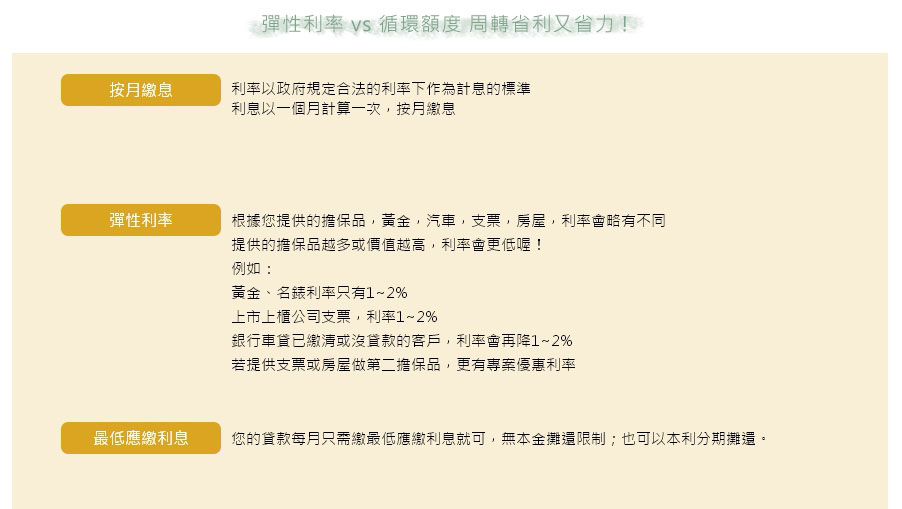 2.利息(以當舖法規定為準) : 月息最低1%~最高2.5%[年利率最低12%最高30%] (提早結清以日計算,無違約金)